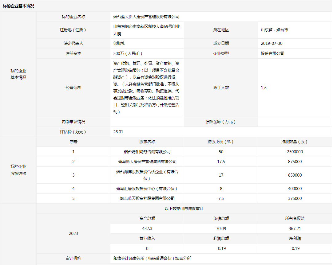 煙臺藍(lán)天新大唐資產(chǎn)管理股份有限公司7.5%股權(quán)(37.5萬股股份)