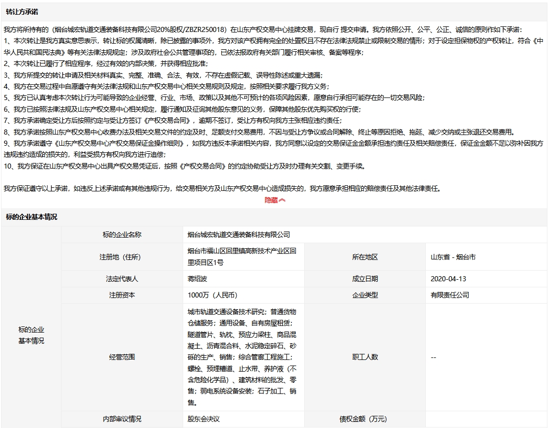煙臺(tái)城宏軌道交通裝備科技有限公司20%股權(quán)