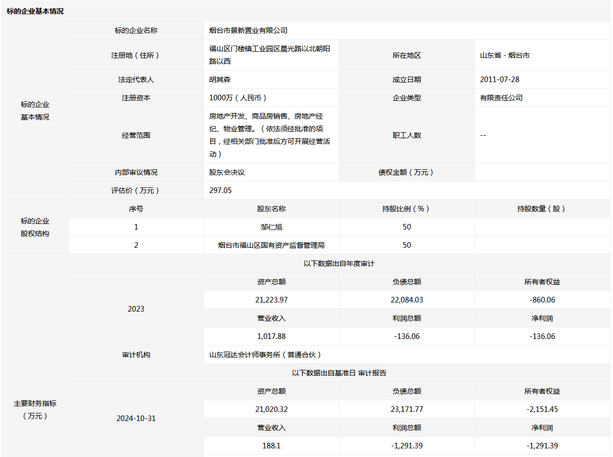 煙臺市景新置業(yè)有限公司50%國有股權