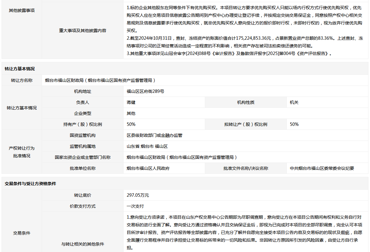 轉讓方: 煙臺市福山區(qū)財政局(煙臺市福山區(qū)國有資產監(jiān)督管理局)