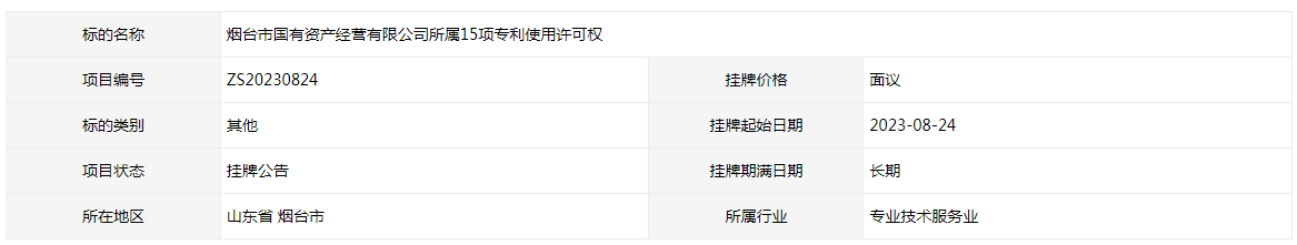 煙臺市國有資產(chǎn)經(jīng)營有限公司所屬15項專利使用許可權(quán)