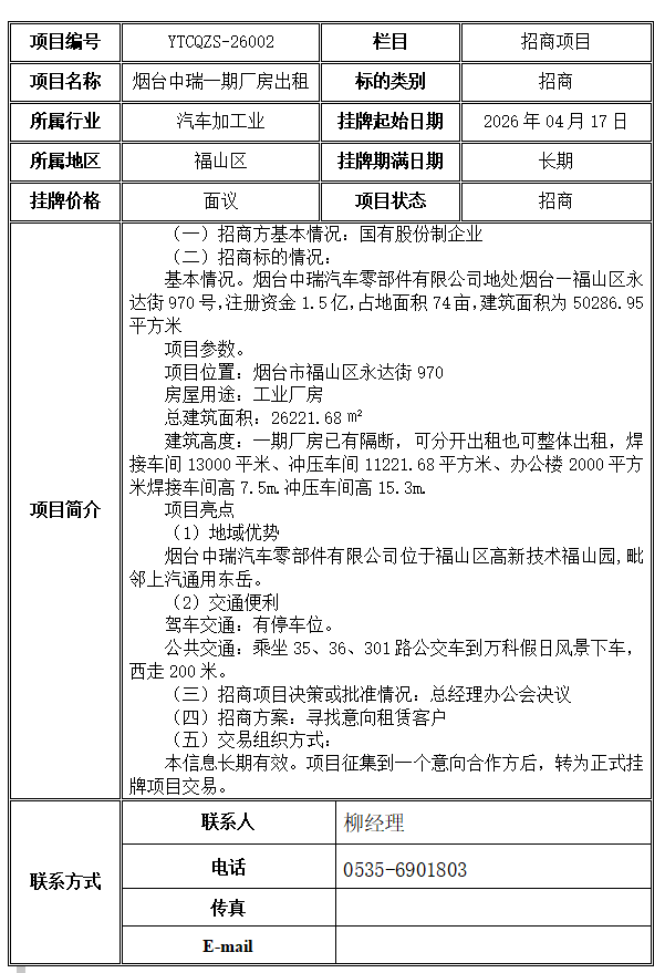 煙臺中瑞一期廠房出租招商項(xiàng)目